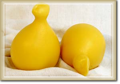 Formaggio a pasta filata paglierina chiara, consistenza tenera, gusto delicato, lievemente aromatico e crosta sottile, a forma caratteristica di pera di 400 g / 1 kg / 2 kg di peso.